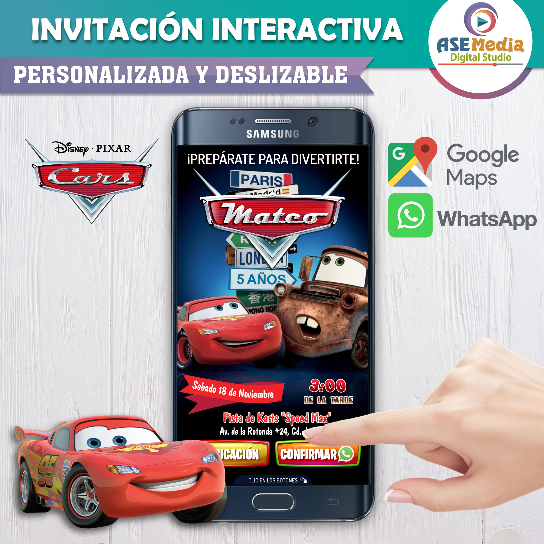 Cars, Rayo McQueen y Mate – Invitación Interactiva de Cumpleaños para WhatsApp