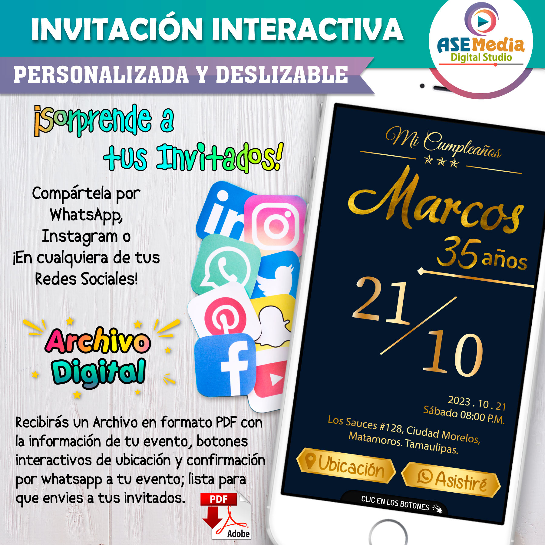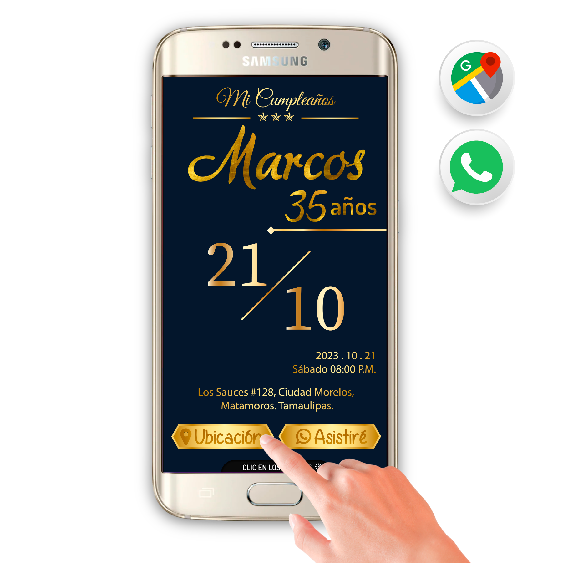 Elegante, Azul y Dorado – Invitación Interactiva de Cumpleaños para WhatsApp
