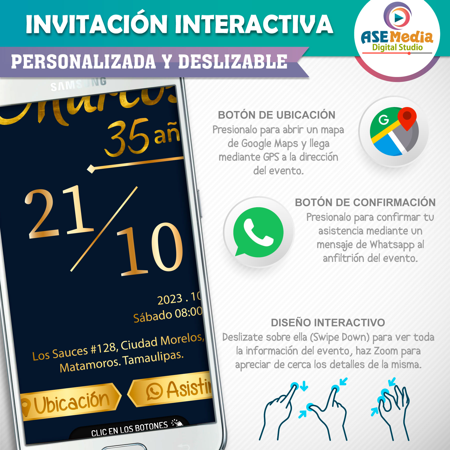 🎉 Invitación interactiva con botones para ubicación y confirmación.