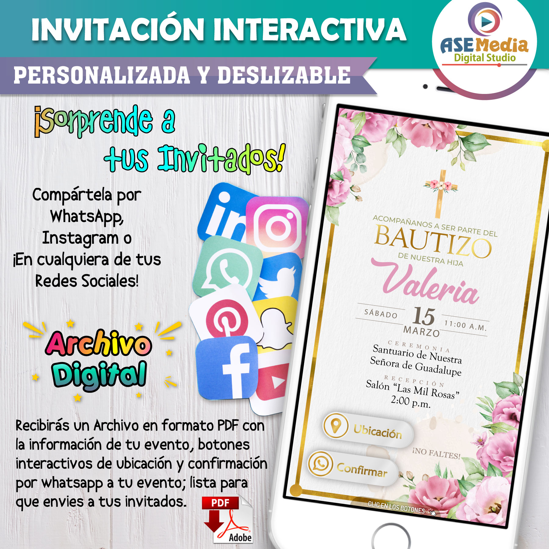 Diseñado para las redes sociales de hoy. Comparte fácilmente en WhatsApp, Facebook, Instagram, y sorprende a tus invitados con una experiencia digital inigualable.