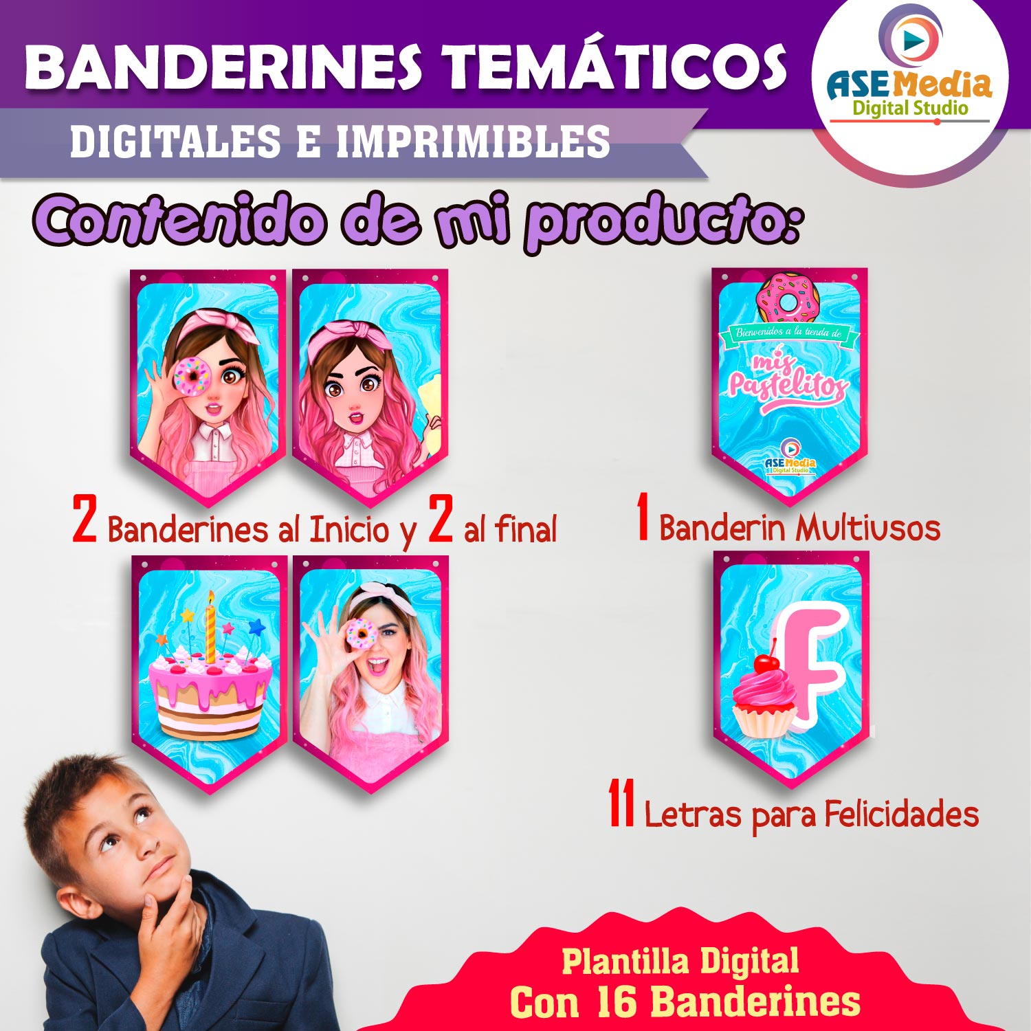 • Modelo digital (.pdf) de 16 banderines con la temática de tu evento.