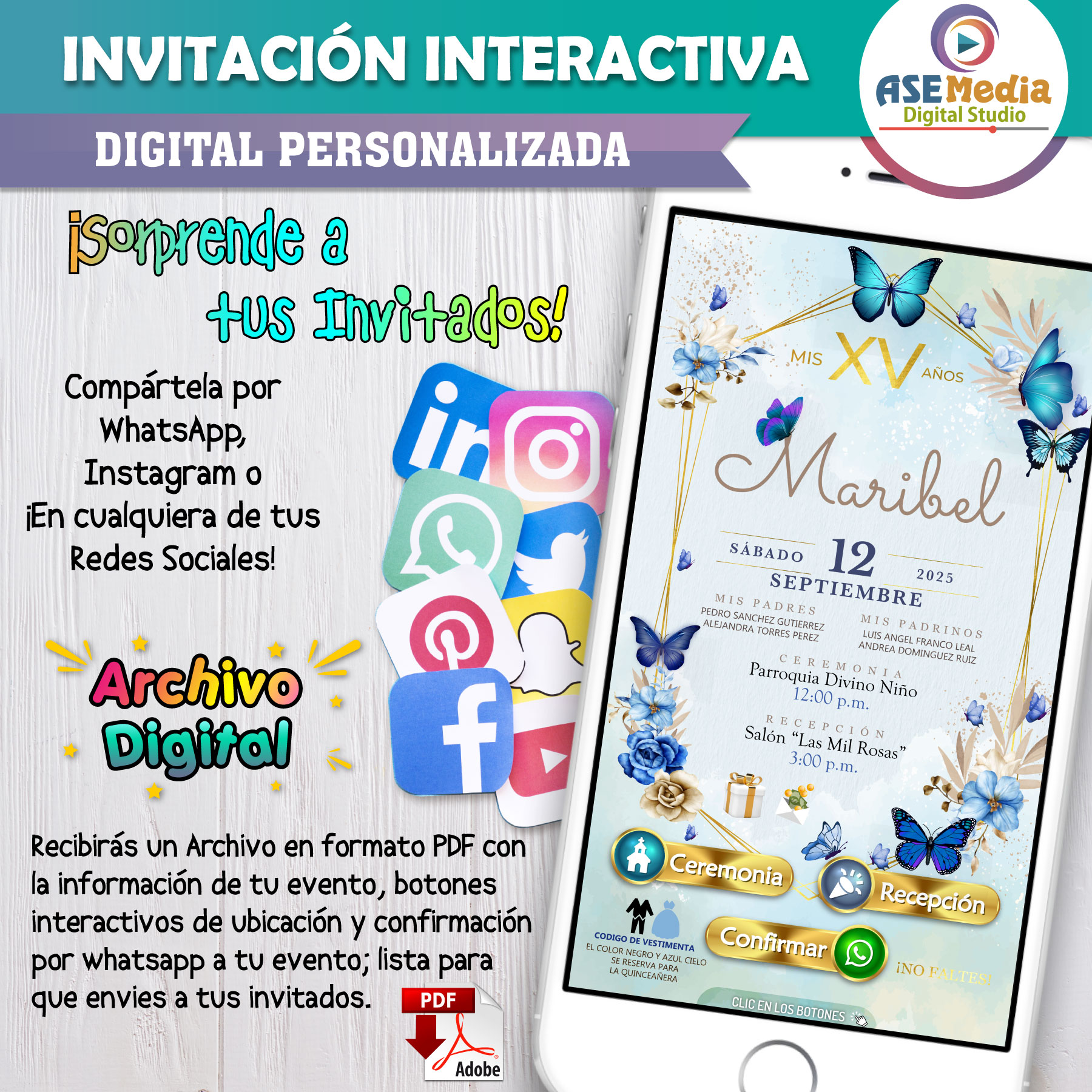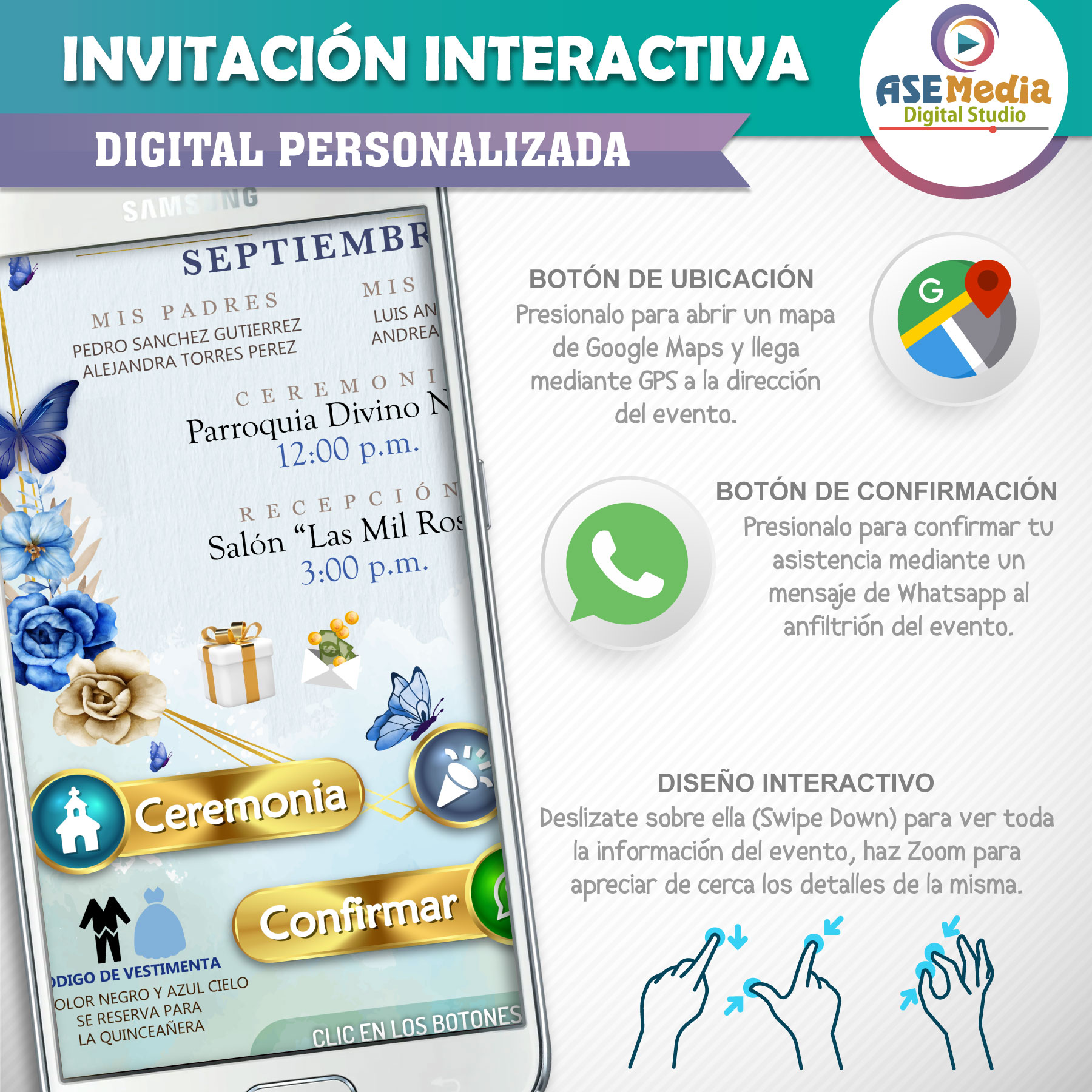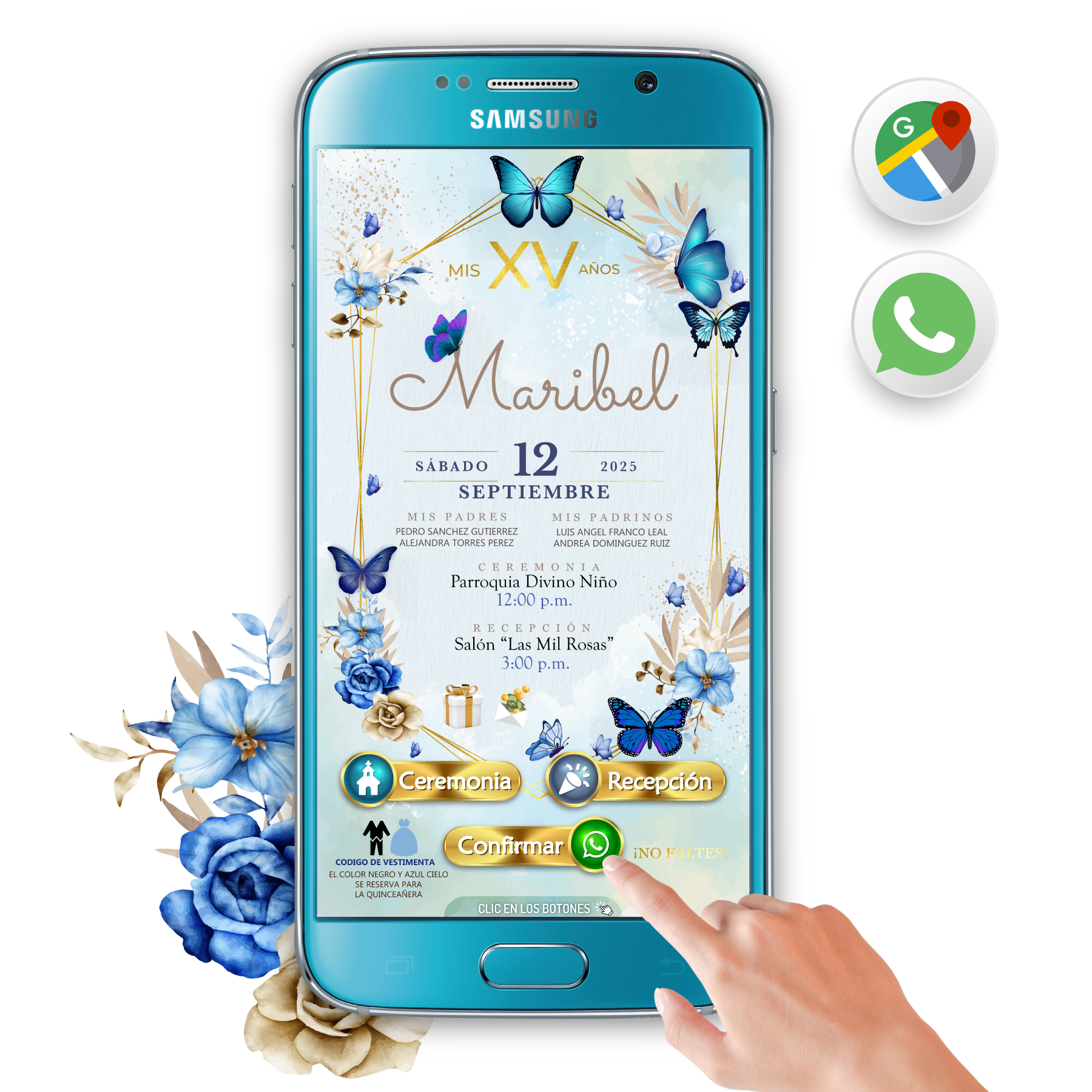 XV Años, Mariposas Azul Dorado – Invitación Interactiva de Cumpleaños para WhatsApp